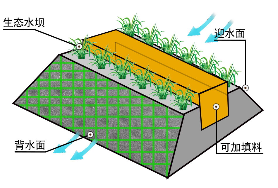 生態(tài)透水壩結(jié)合高效富氧生物技術(shù),水中污染物在物理沉降、自然降解、水生生物吸收的作用下,凈化水質(zhì)。生態(tài)透水壩利用物理過(guò)濾、植物吸收和微生物降解。物理過(guò)濾在于堆積壩體的濾料之中形成許多空隙,污水在經(jīng)過(guò)生態(tài)透水壩時(shí),水中的污染物被吸附和攔截下來(lái)。生態(tài)透水壩上種植的水生植物產(chǎn)生的大量根系深入壩體,吸收水中的營(yíng)養(yǎng)鹽和重金屬。許多微生物和原生動(dòng)物生長(zhǎng)于濾料中,它們利用污水中的營(yíng)養(yǎng)物質(zhì)生存和繁殖,進(jìn)而凈化了水質(zhì)。適用于流速緩慢、污染嚴(yán)重的非行洪中小河流。