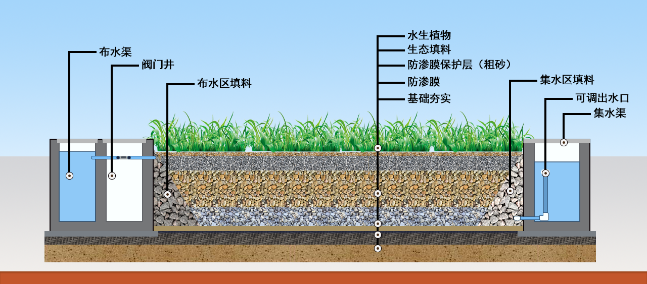 高效富氧濕地產(chǎn)品將純氧設(shè)備與模塊化的潛流濕地相結(jié)合,依靠生物處理技術(shù)聯(lián)用,再生水在進(jìn)入河道前,先經(jīng)過(guò)人工濕地處理,再進(jìn)入推流富氧生物處理技術(shù)系統(tǒng)。進(jìn)入人工濕地的再生水呈波形流動(dòng),使其在垂直方向上多次經(jīng)過(guò)濕地內(nèi)部具有不同處理特性的構(gòu)造層以調(diào)節(jié)再生水在濕地內(nèi)的滯留凈化時(shí)間,從而強(qiáng)化對(duì)河道水質(zhì)的凈化效果。